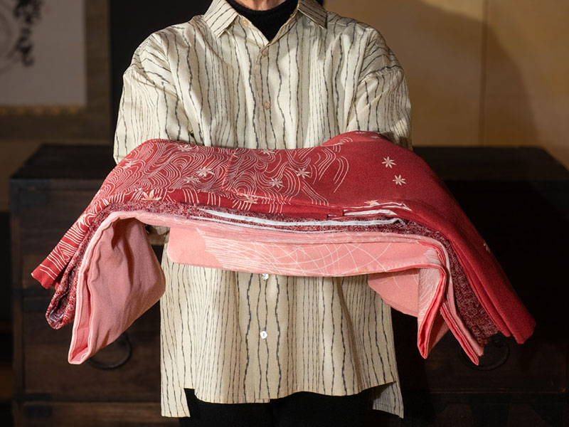 タンスに眠ったまま行き先を失った着物たちは時間が過ぎていくのを待つだけ。そこにデザインを加えて新たな役目を与える。新しいより懐かしい。日本人としてルーツを辿るようなブランドをつくっていきたいと思います。